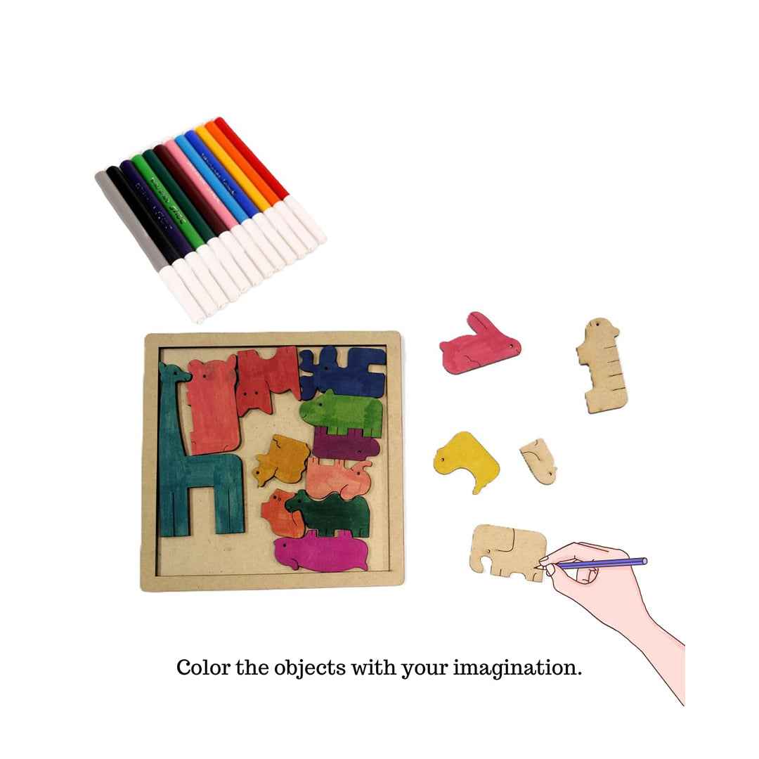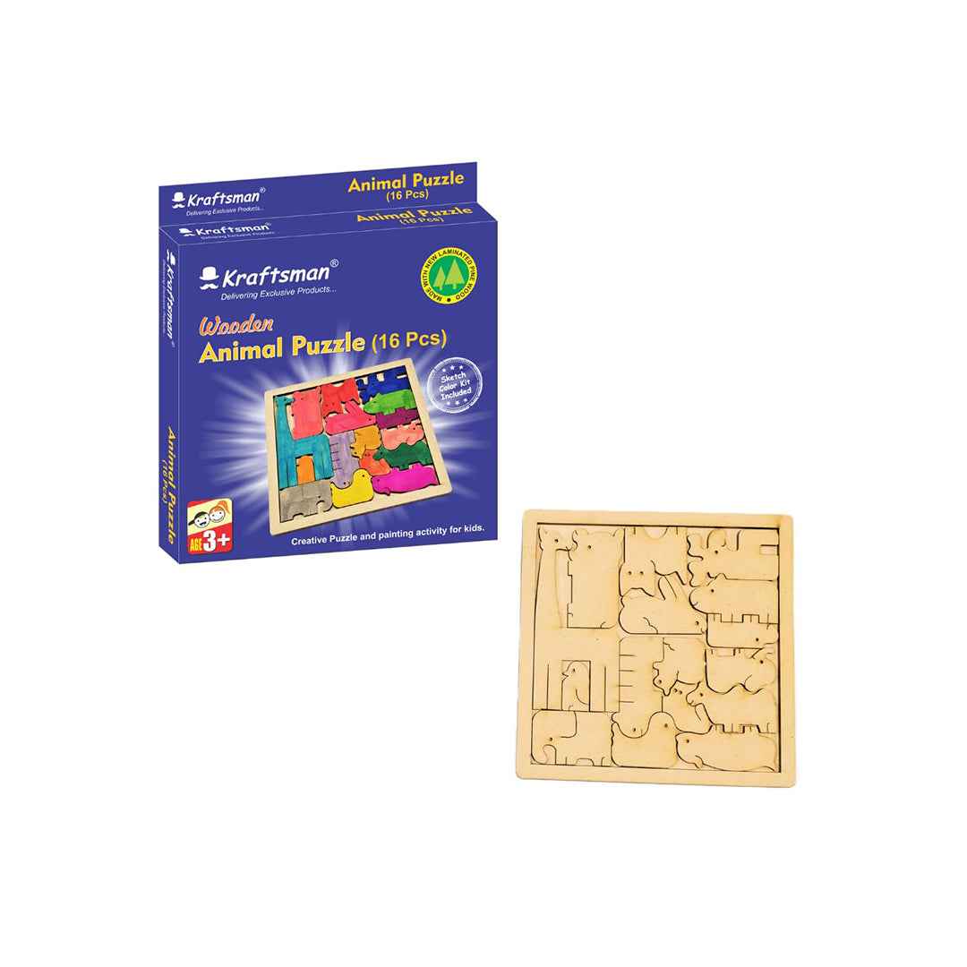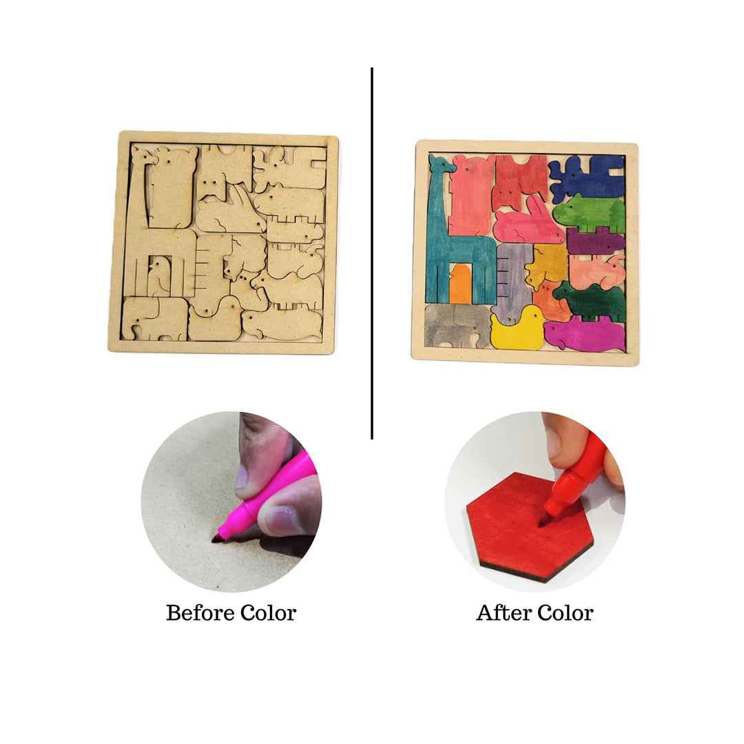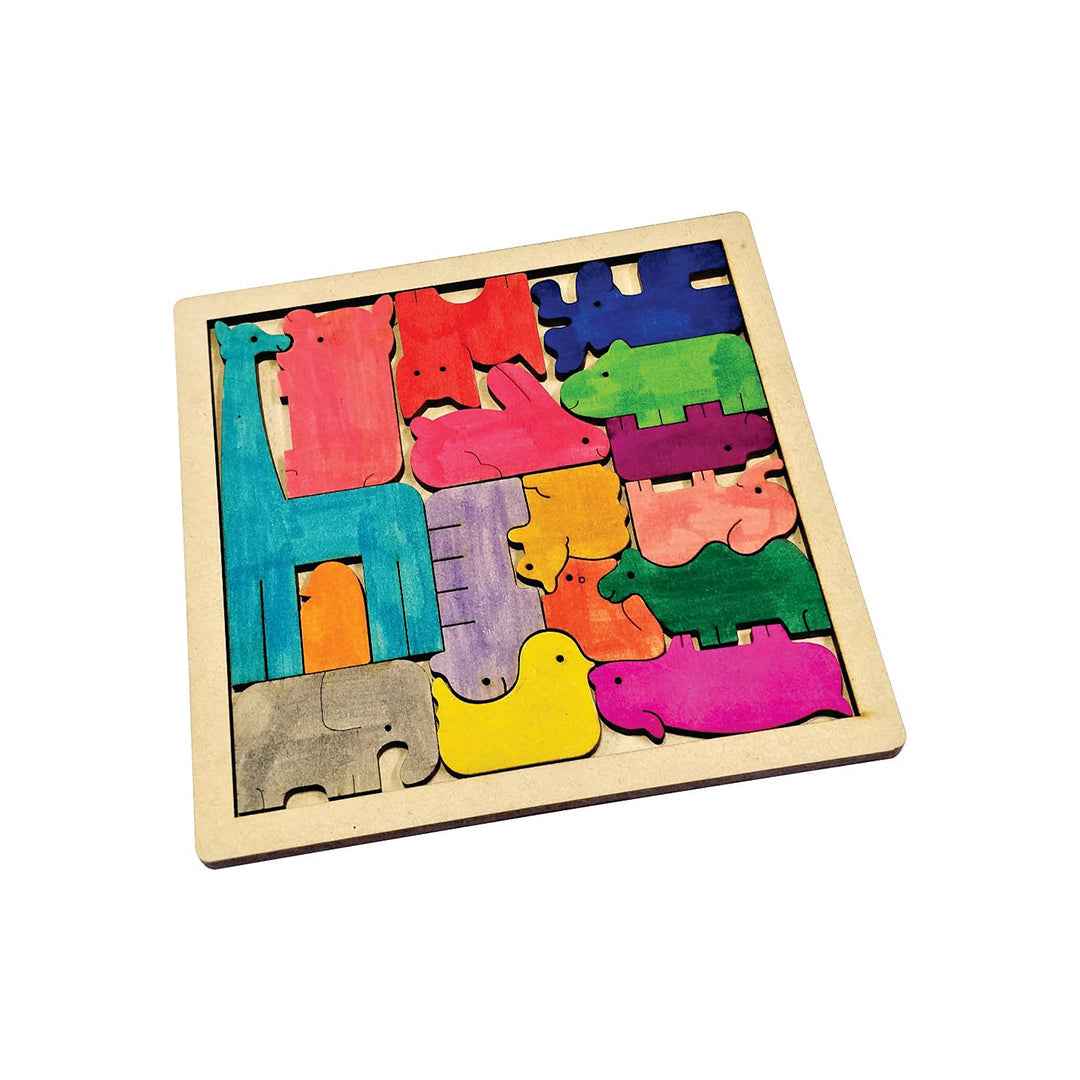 - Includes: A square puzzle frame, 16 unique animal-shaped puzzle pieces, and a complete color kit.