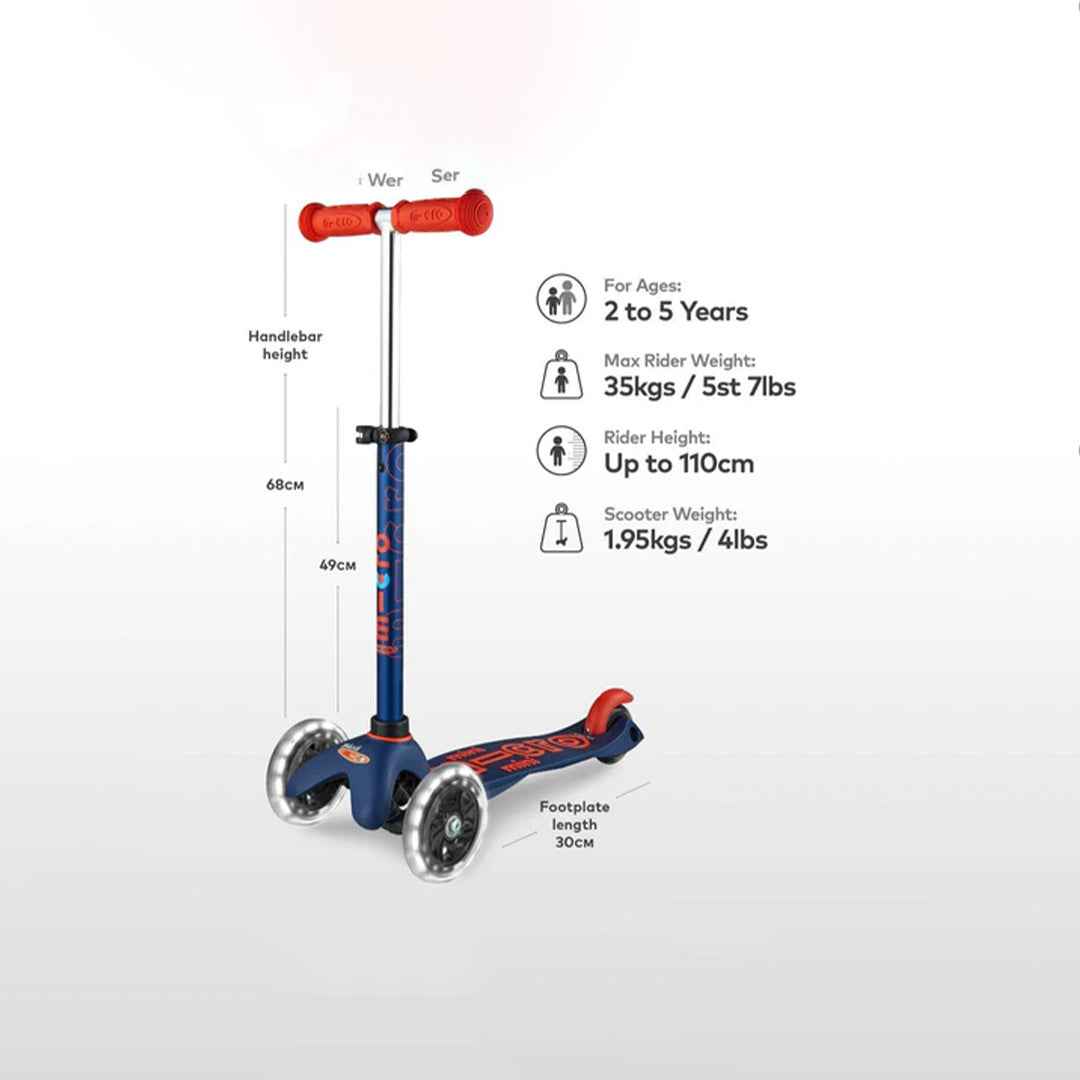 - Includes: 1 Micro Mini Deluxe Scooter (Navy Blue), Adjustable & Removable T-Bar Handle, Instructions.