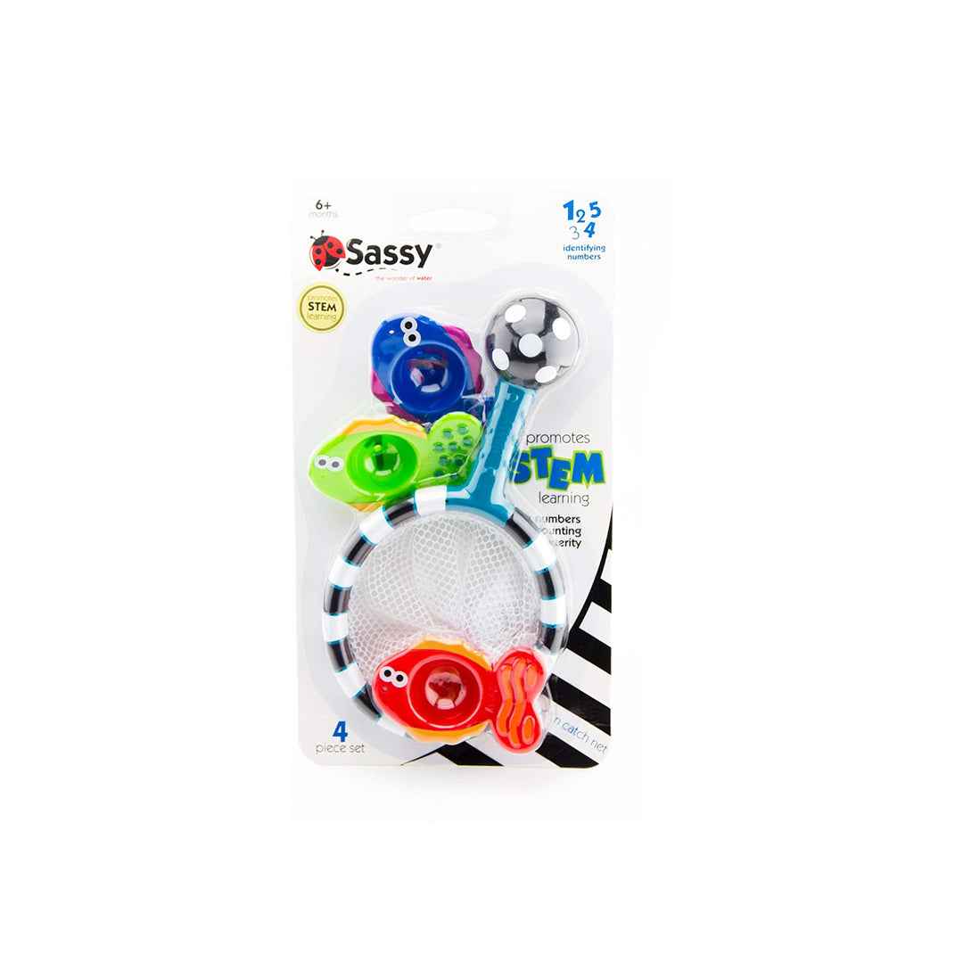 Transform bath time into an exciting learning adventure with the Sassy Catch and Count Net! Designed for babies 6 months and up, this developmental set includes an easy-to-grasp net and three colorful, floating fish. The fish double as scoopers and strainers, featuring numbers to introduce early counting concepts. Scooping and catching the fish actively strengthens fine motor skills, hand-eye coordination, and teaches cause & effect through engaging water play.