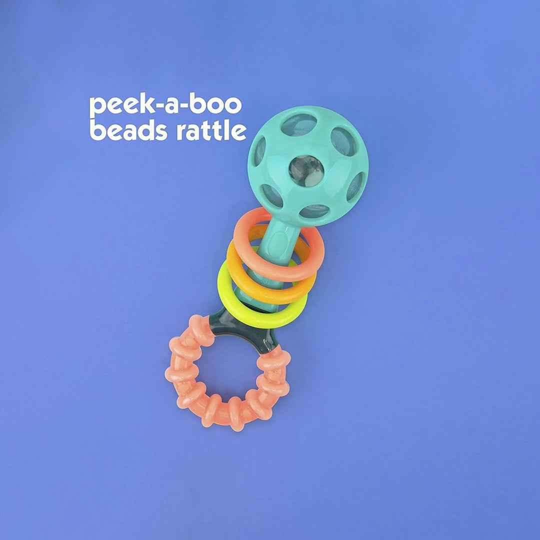 - Features high-contrast colors and gentle sounds (rattle ball, click-clack rings) to stimulate visual and auditory senses.