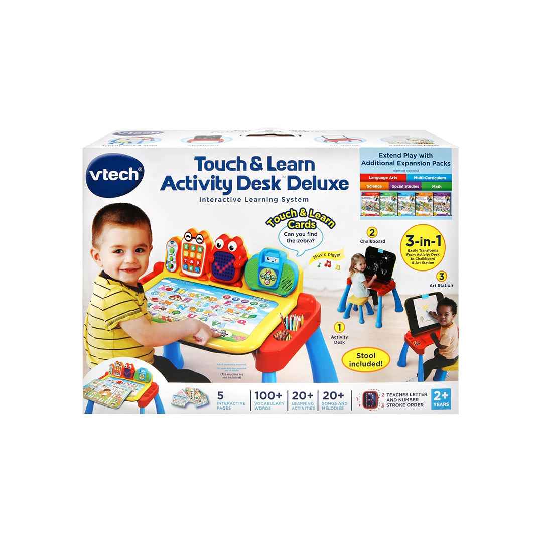 - Includes: 1 x VTech Touch & Learn Activity Desk Deluxe, 1 x stool, 5 activity pages, and 2 double-sided cards.