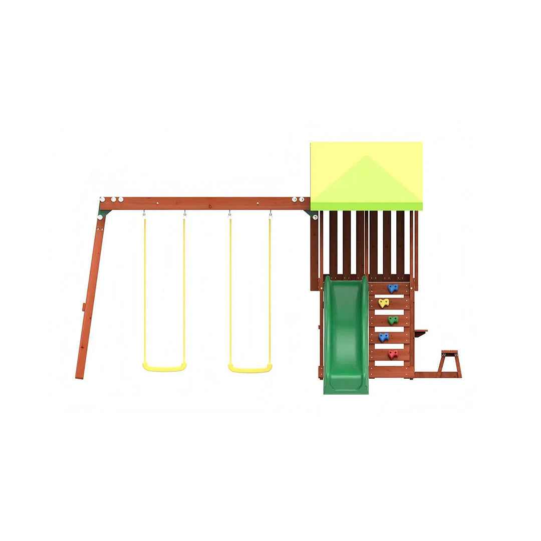 - ملعب متكامل للفناء الخلفي: أولاً وقبل كل شيء، هذه المجموعة عبارة عن ملعب منزلي متكامل. على سبيل المثال، توفر خمسة أنشطة رئيسية في هيكل واحد مدمج. تشمل أرجوحتين، وزحليقة، وطاولة نزهة مدمجة، وجدار تسلق مليء بالتحديات، مما يوفر في النهاية متعة لا تنتهي.